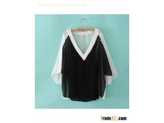 hite and Black Batwing Sleeve V-Neck Splice Blouse
